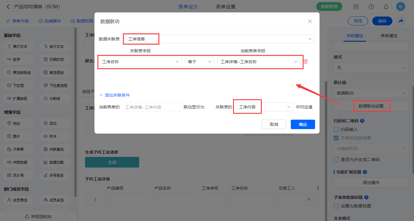 6)【工序详情.工序名称】字段,选择设置为关联其他表单数据,关联工序信息的【工序名称】字段;