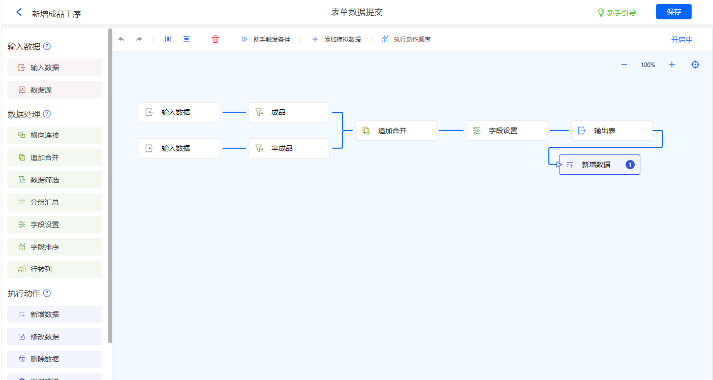 名称为新增成品工序的数据助手,新增新增数据执行动作,通过数据处理得到输出表;