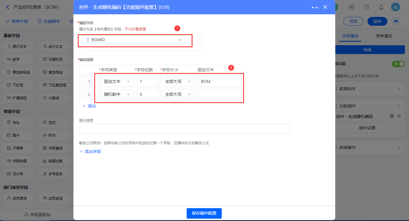 设置【控件 - 生成随机编码】的功能插件,如图配置;