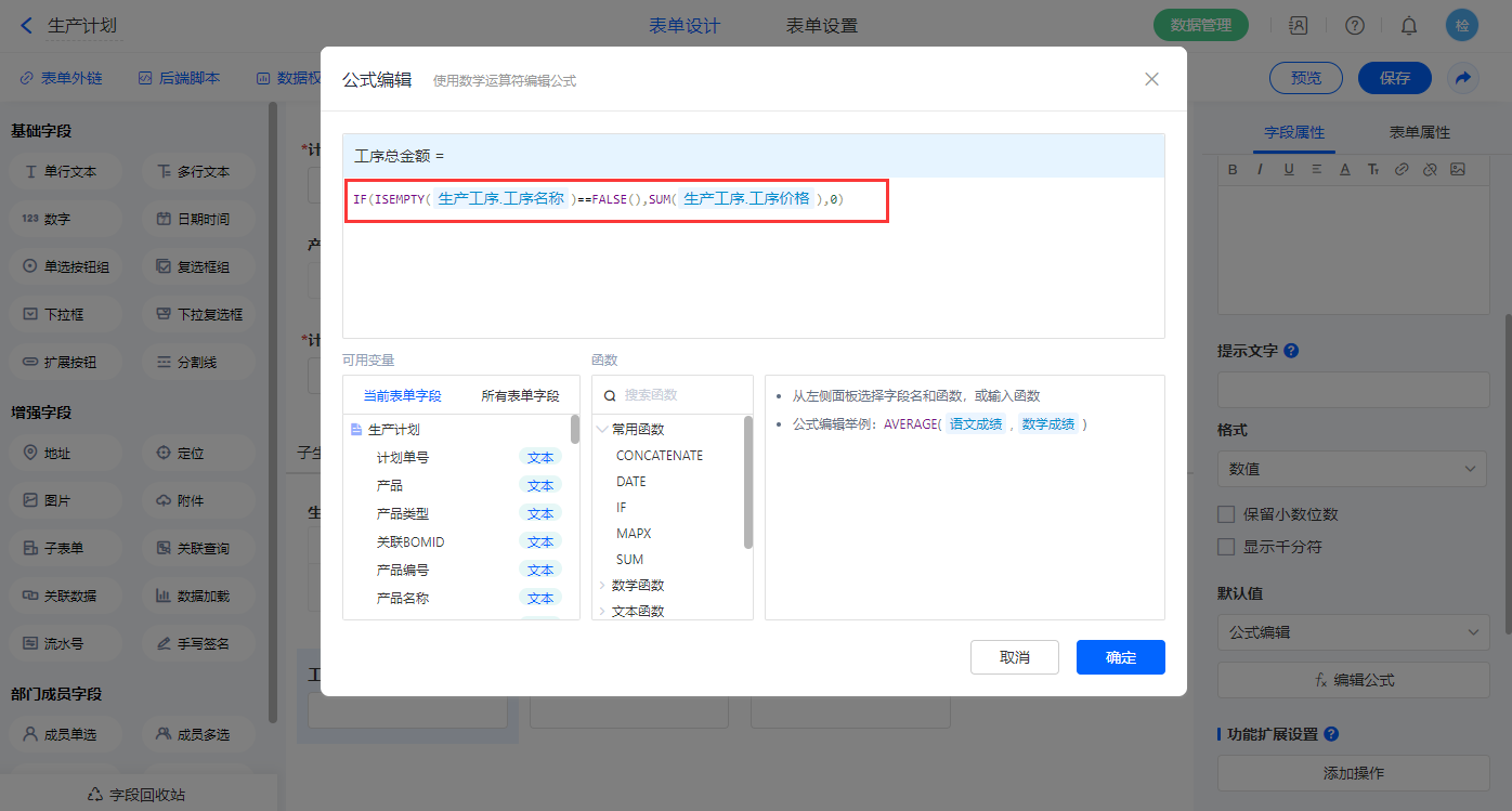【工序总金额】字段,设置默认值为公式编辑,如图设置公式;