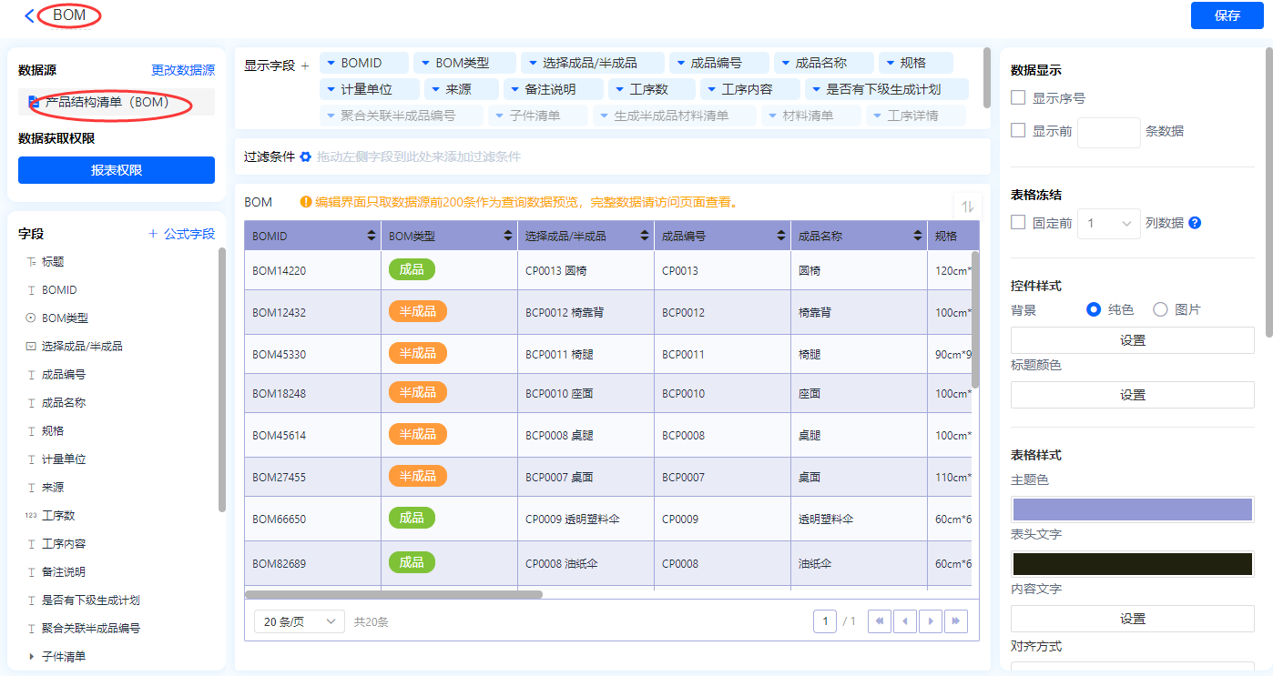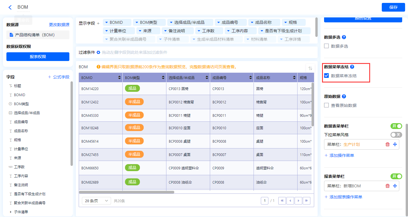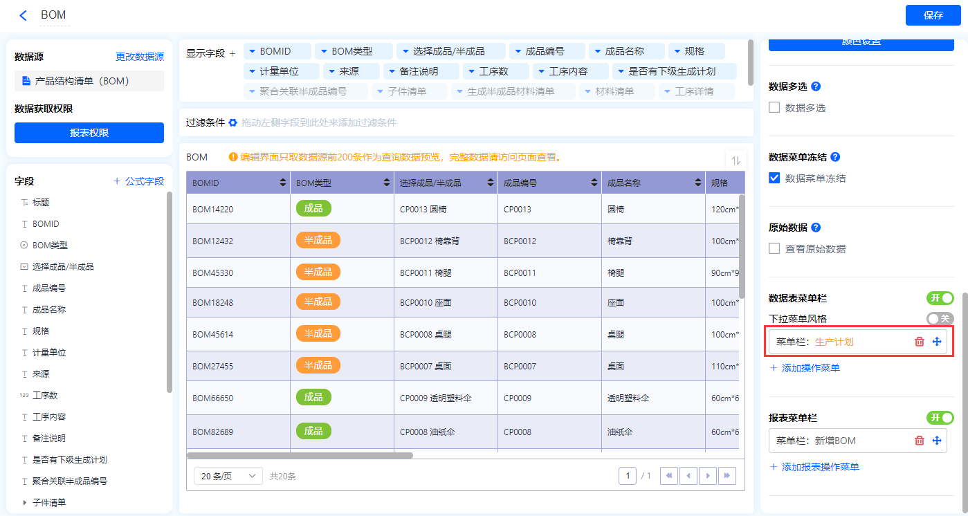 1)新增【BOM信息表】报表,用基础报表【数据表】展示数据源为表单【产品结构清单(BOM)】的数据;