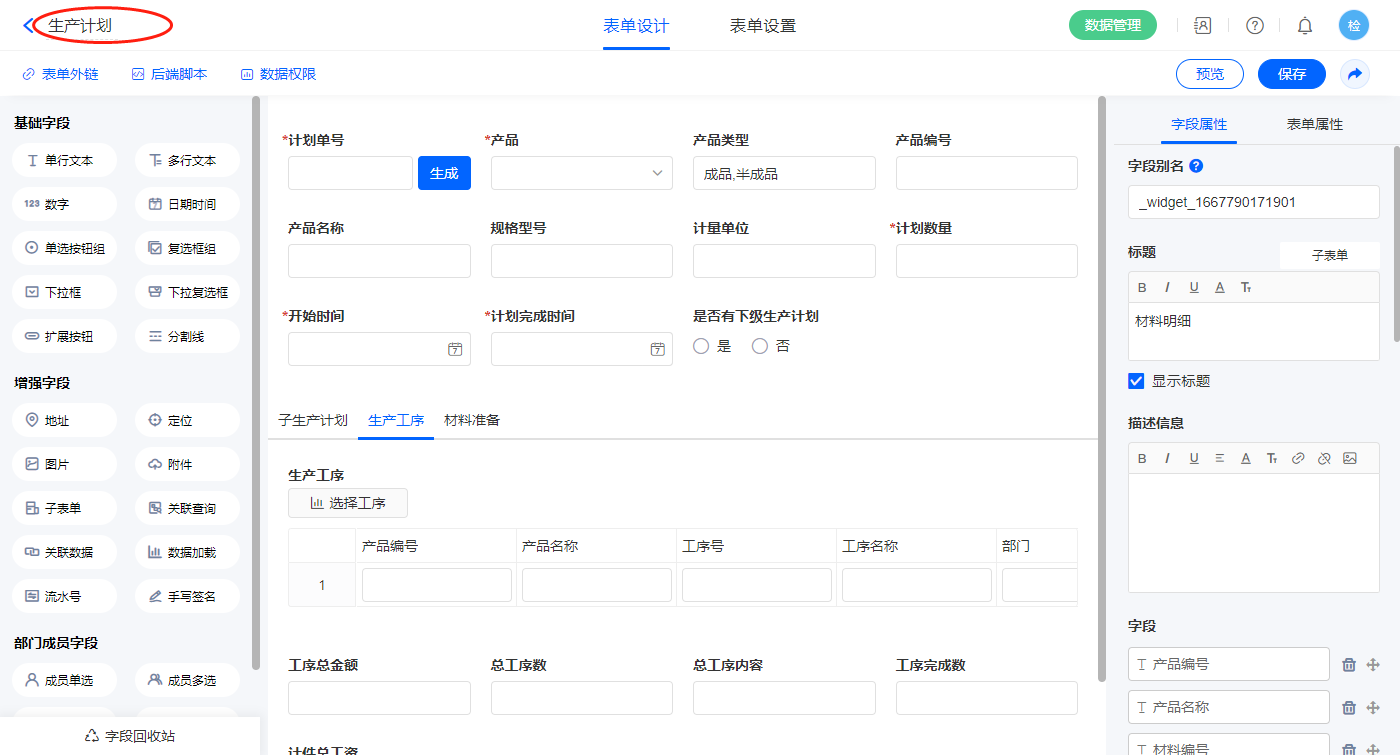 | 计划数量 | 数字 | 材料明细 | 子表单 |