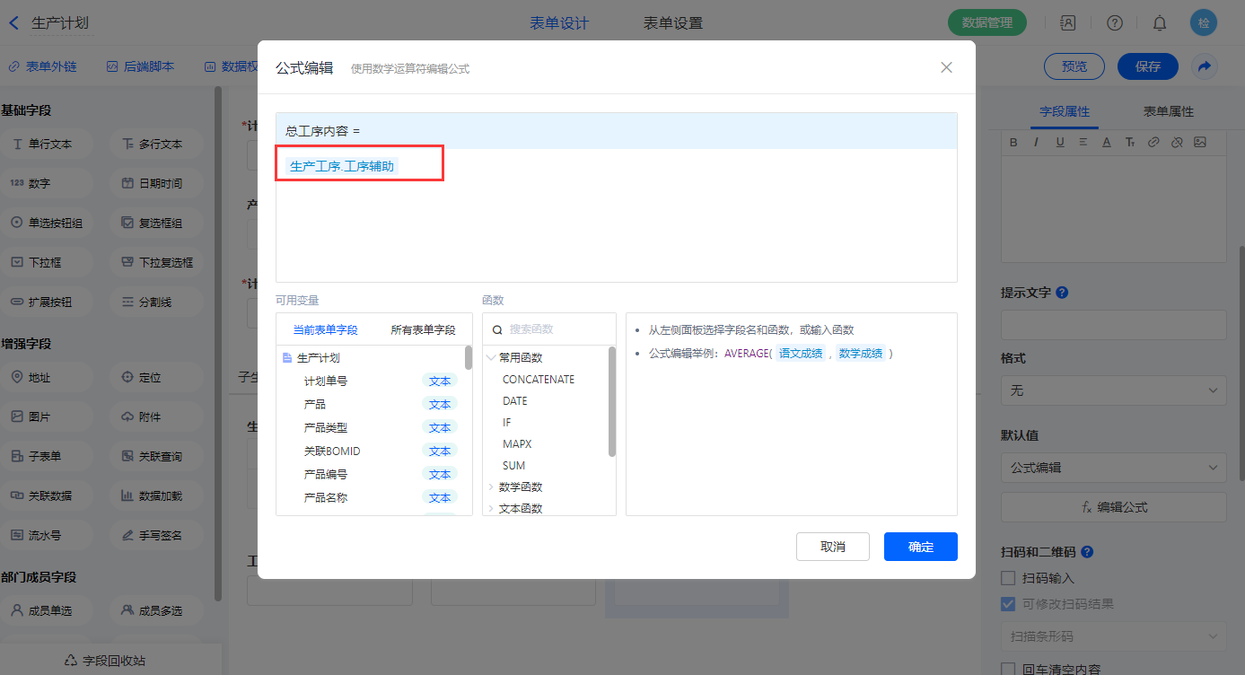 【总工序内容】字段,设置默认值为公式编辑,如图设置公式;