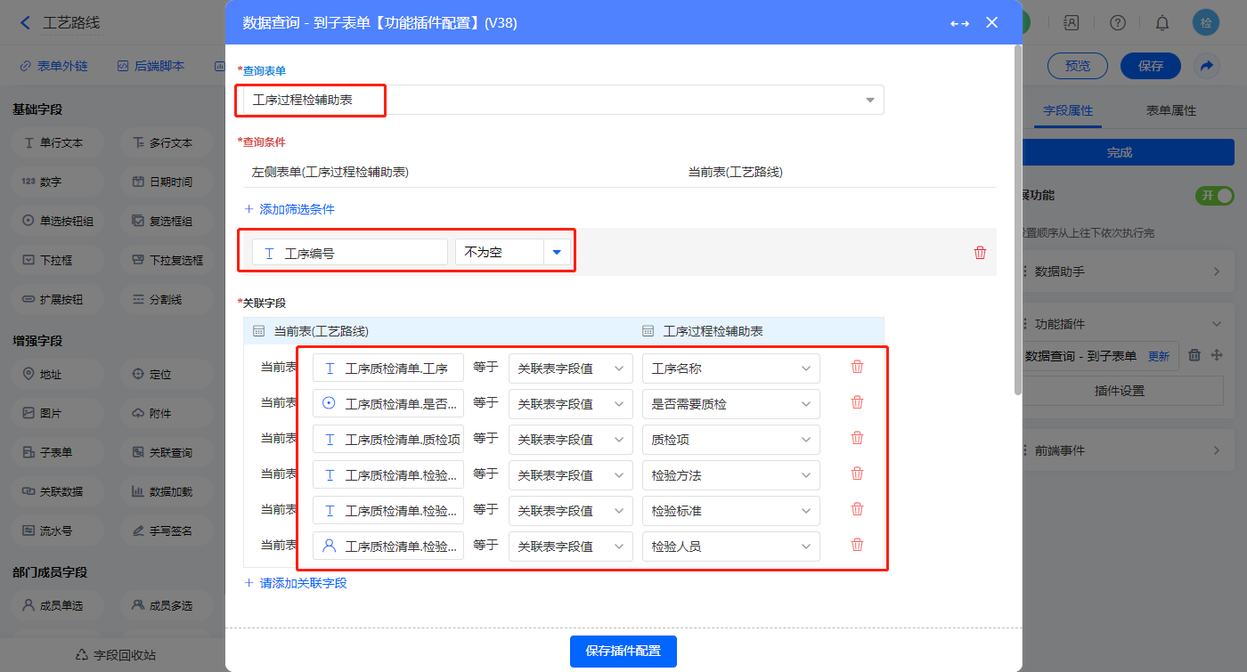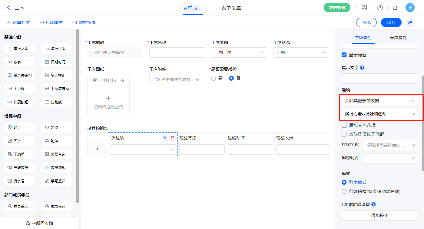 1)【过程检明细.质检项】字段,选择设置为关联其他表单数据,关联质检方案的【检验项名称】字段;