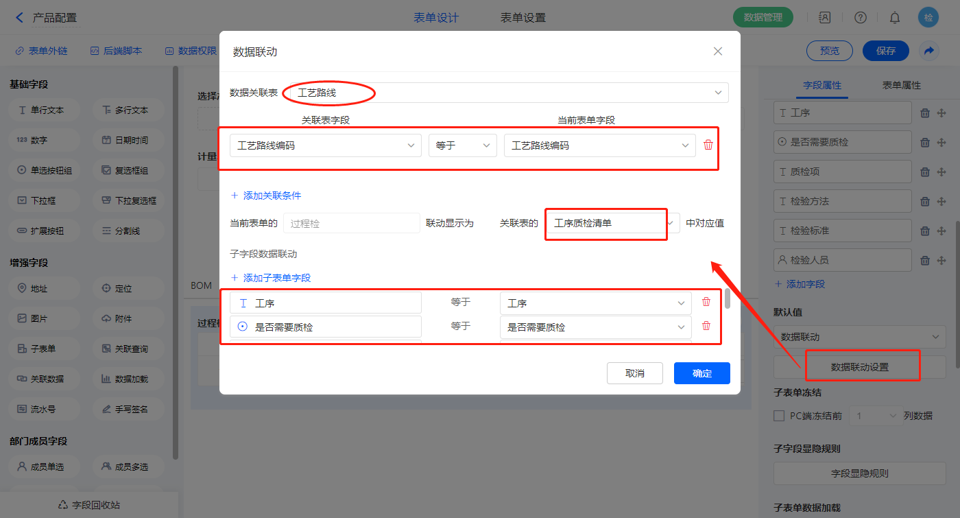 5)【过程检】字段,设置默认值为数据联动,设置联动条件及联动字段;