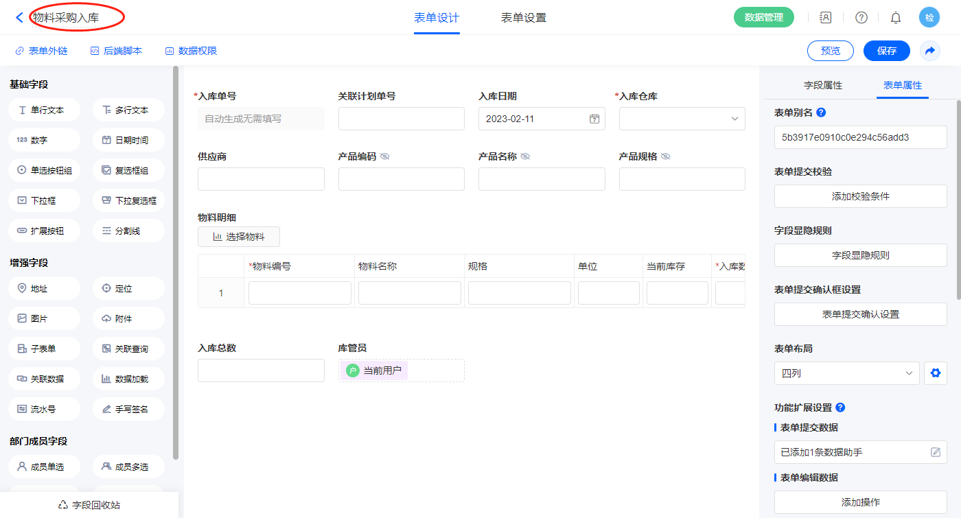 2)【物料明细】子表单字段,设置默认值为数据联动,设置联动条件及联动字段;