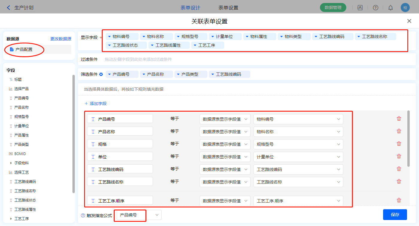 1)【选择投产计划】数据加载字段,数据源为【生产计划】,添加显示字段设置赋值字段及筛选条件,触发指定公式为【工艺路线编码】字段,设置完点击保存;