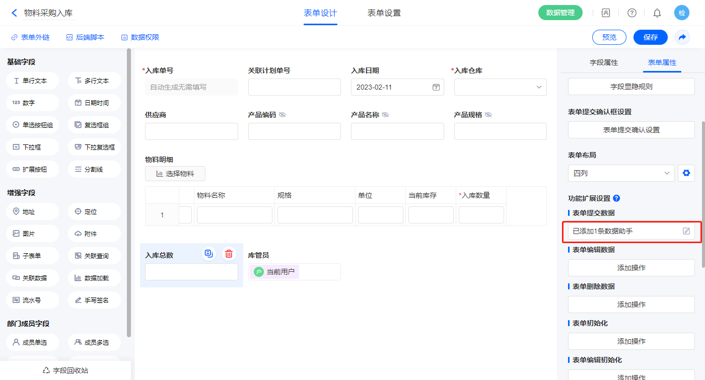 1)【物料明细】子表单开启数据加载,数据源为【物料信息】,添加显示字段设置赋值字段及筛选条件,点击保存;