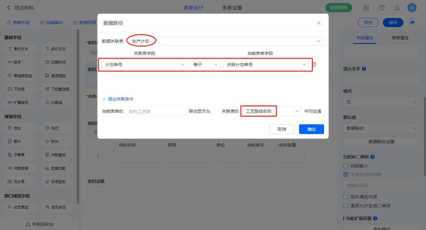 1)【收料工艺线编码】、【收料工艺线】设置默认值为数据联动,关联表及关联条件相同,设置对应的联动字段即可;