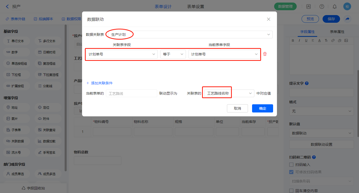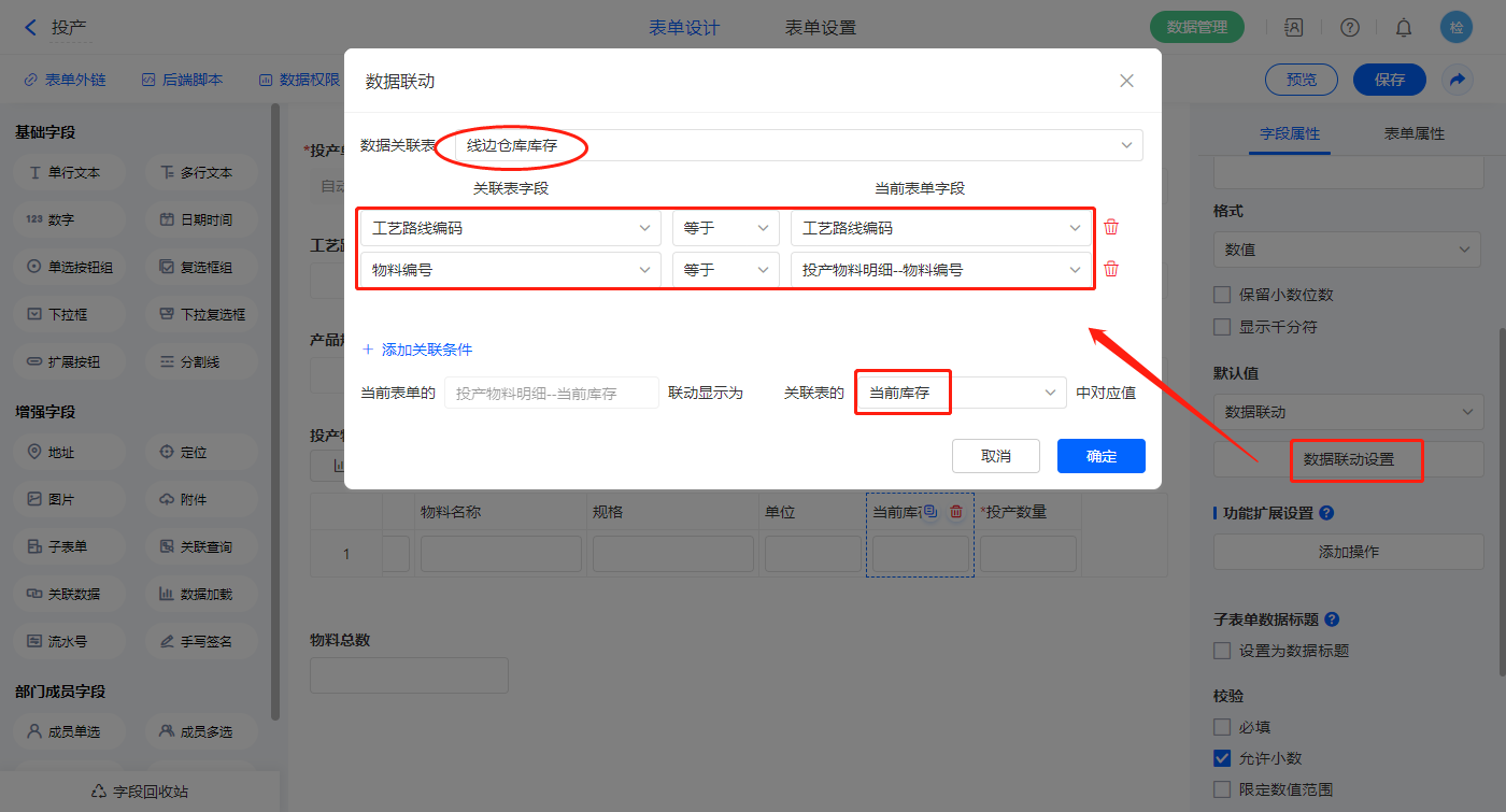 【投产物料明细】子表单字段,设置默认值为数据联动,设置联动条件及联动字段;