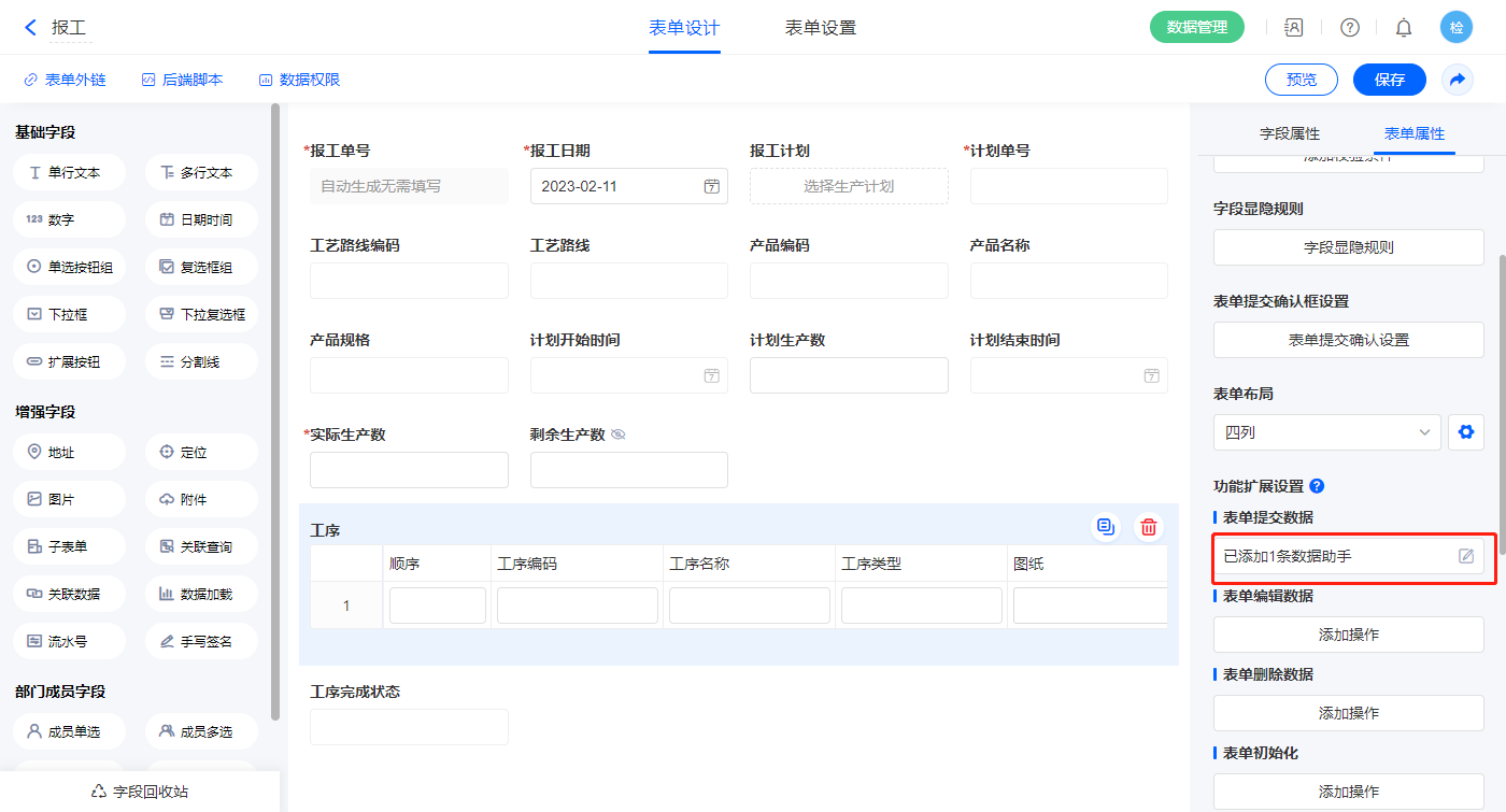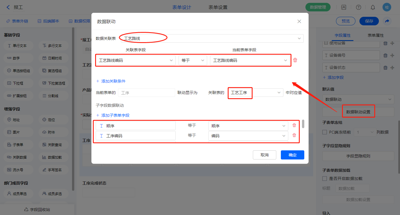 4)【工序】子表单字段,设置默认值为数据联动,设置联动条件及联动字段;