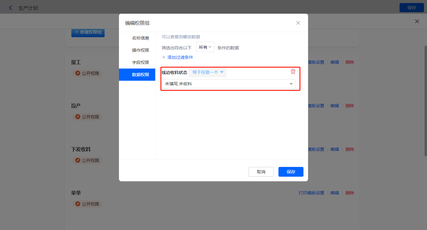 线边收料数据权限添加过滤条件,【线边收料状态】等于未填写,未收料;