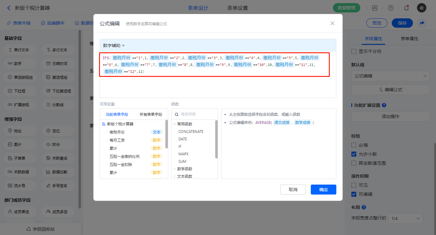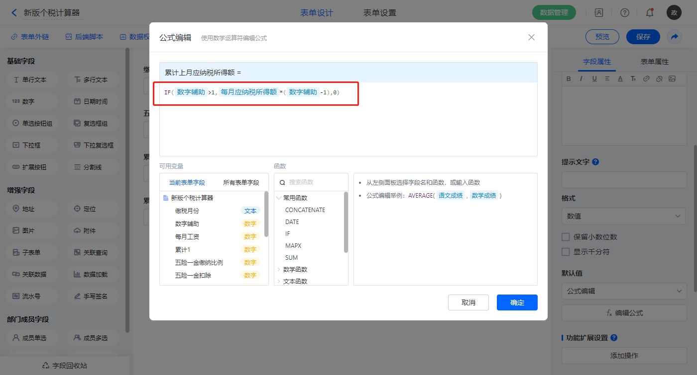 【本月需缴纳个税】字段,默认值选择公式编辑,如图设置公式;