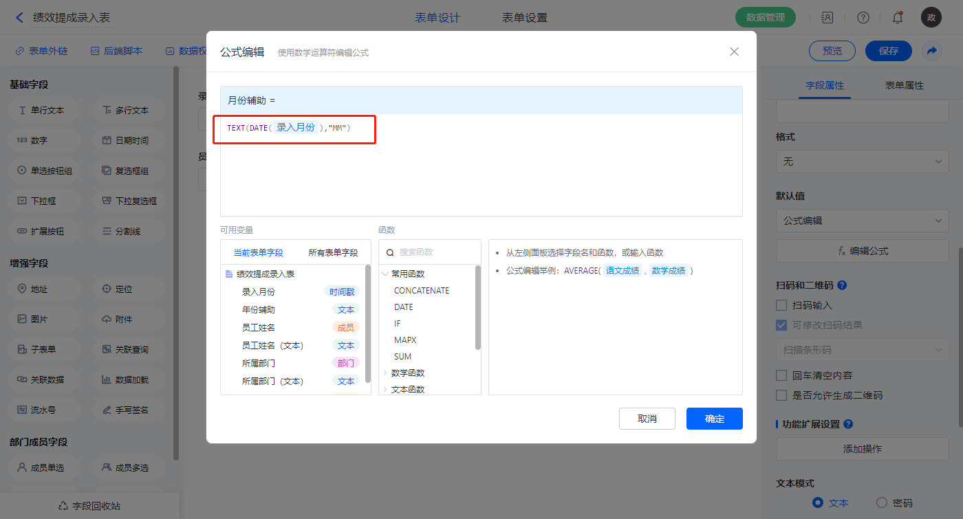 【月份辅助】字段,默认值选择公式编辑,如图设置公式;