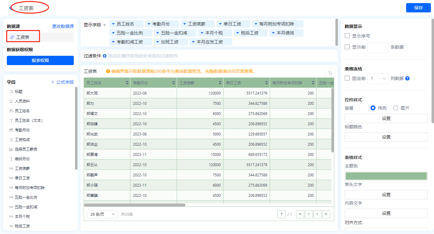 1)新增【员工薪资表】报表,用基础报表【数据表】展示数据源为表单【工资表】的数据;