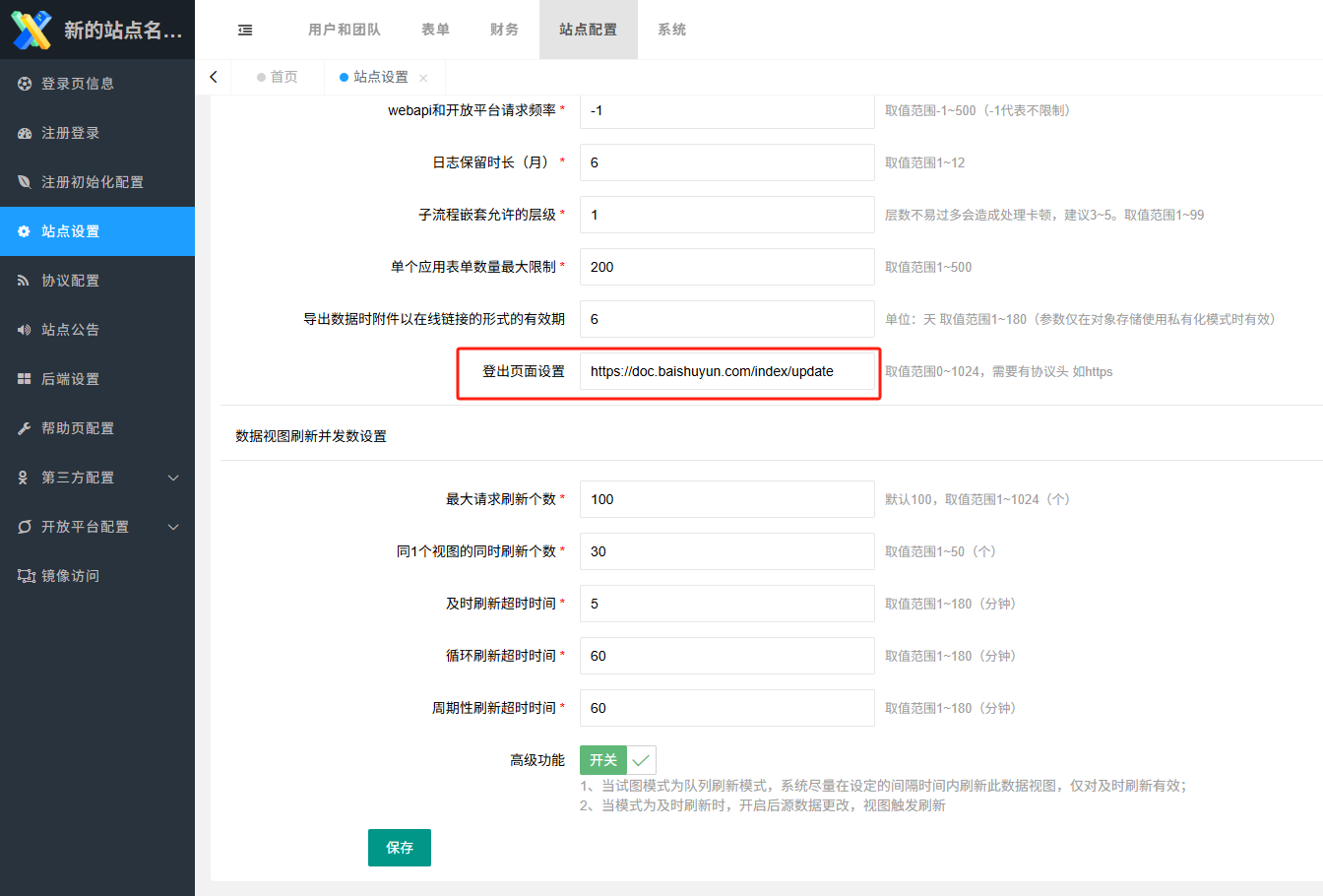 - 后台>站点设置,增加可以设置全站的默认退出指定链接。
