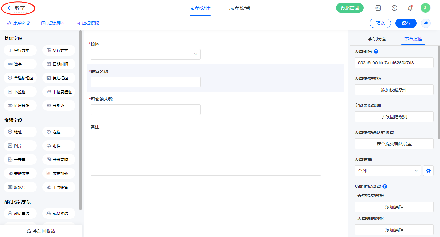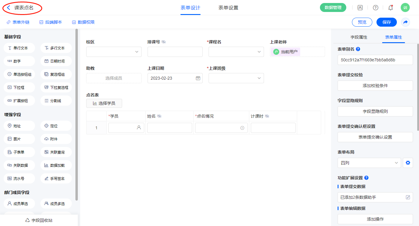1)新增【课堂信息表】报表,用基础报表【数据表】展示数据源为表单【排课明细】的数据;