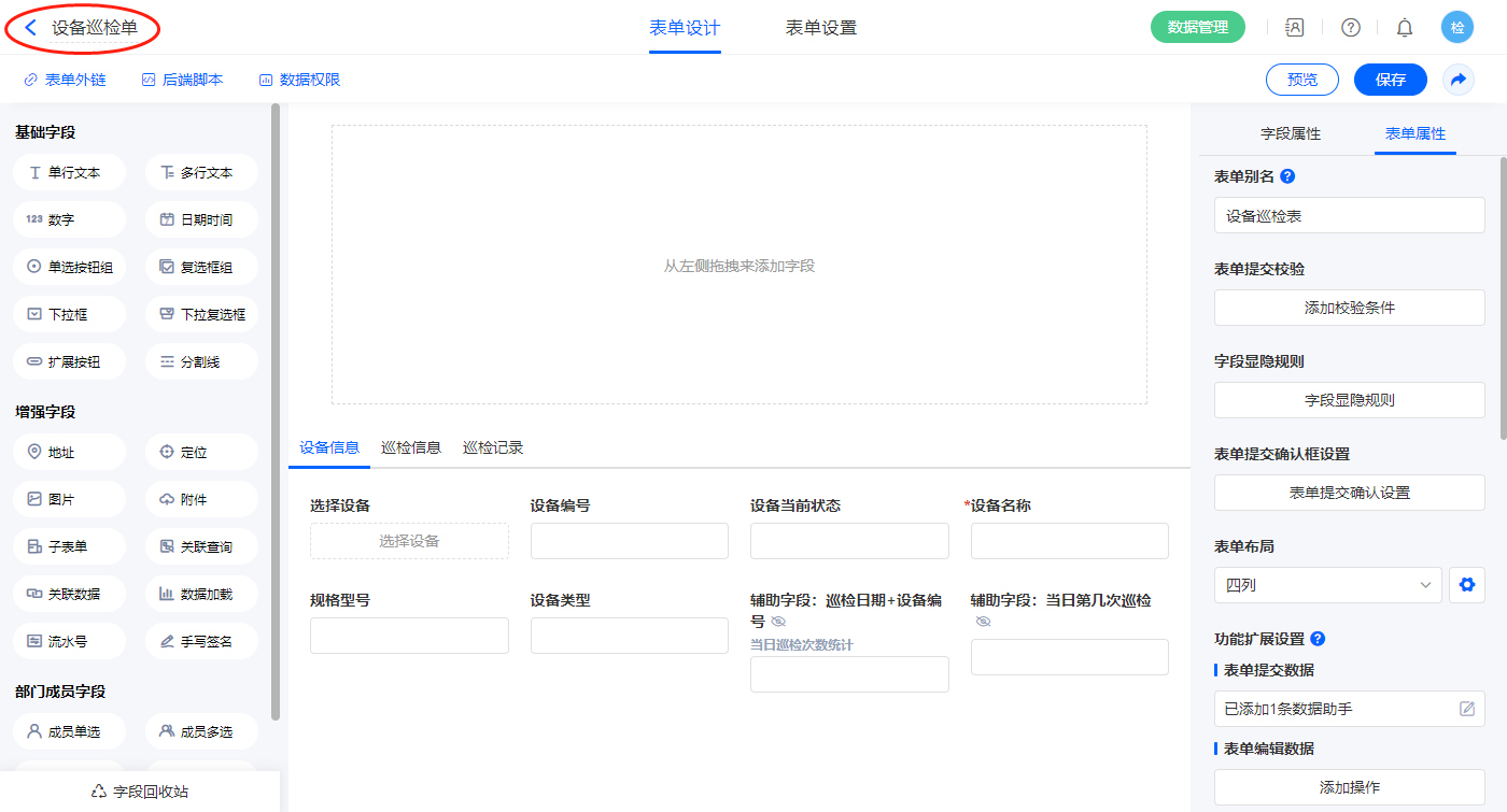 | 选择设备 | 数据加载 | 辅助字段:巡检日期+设备编号 | 单行文本 |