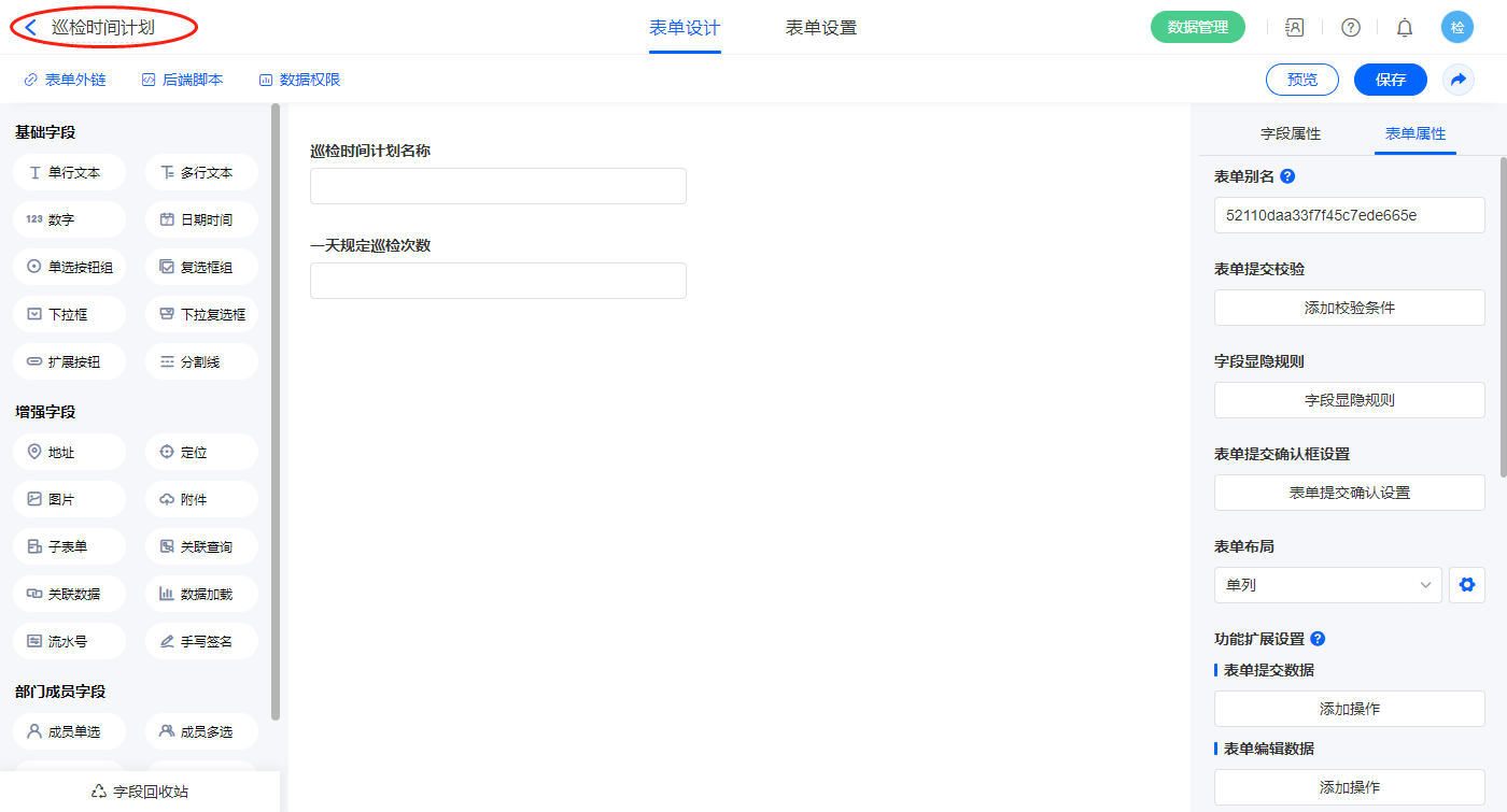 | 巡检时间计划 | 单行文本 | 巡检人员 | 成员单选 |