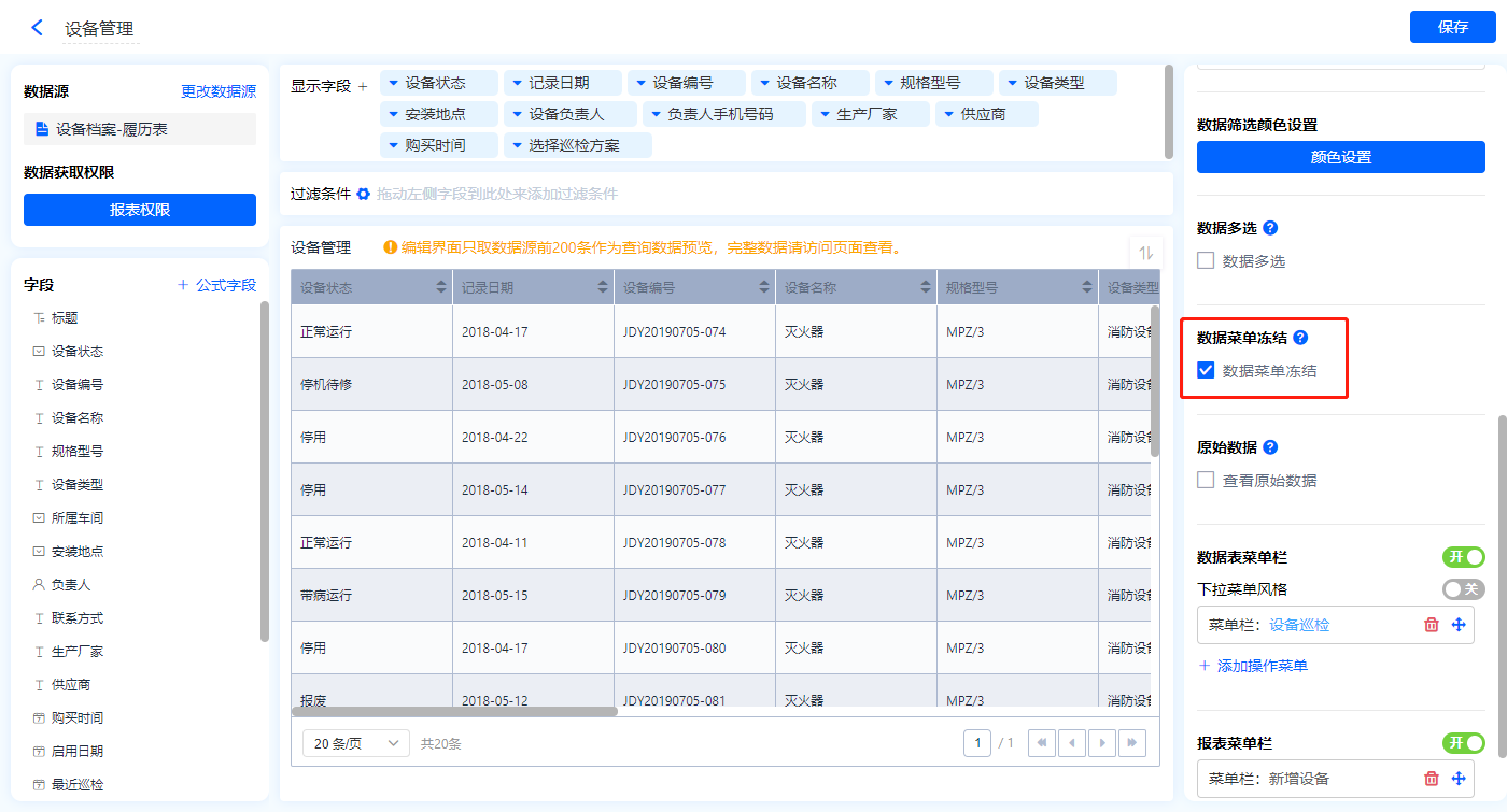 1)新增【设备管理】报表,用基础报表【数据表】展示数据源为表单【设备档案-履历表】的数据;