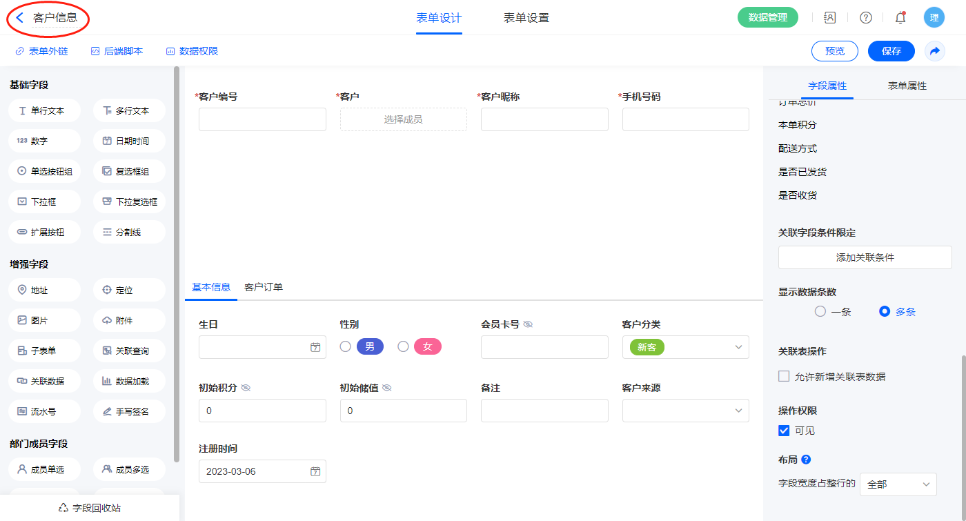 | 客户编号 | 单行文本 | 客户 | 成员单选 |