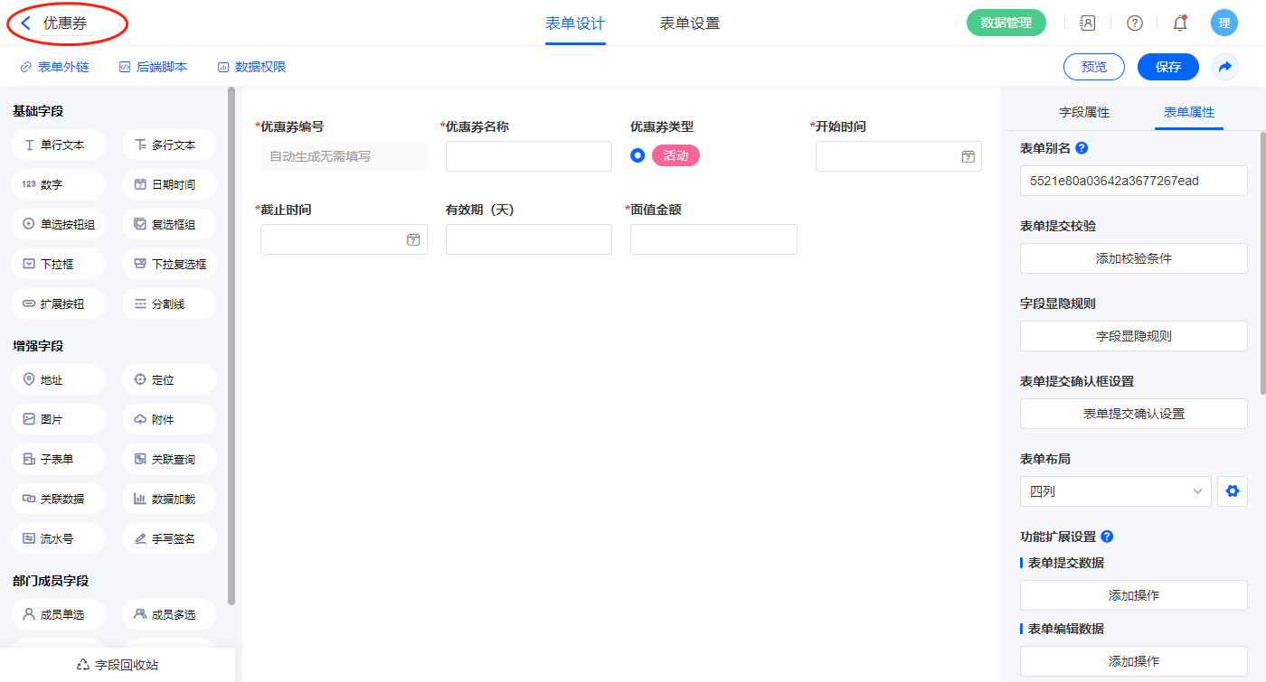 | 优惠券名称 | 单行文本 | 会员 | 成员单选 |