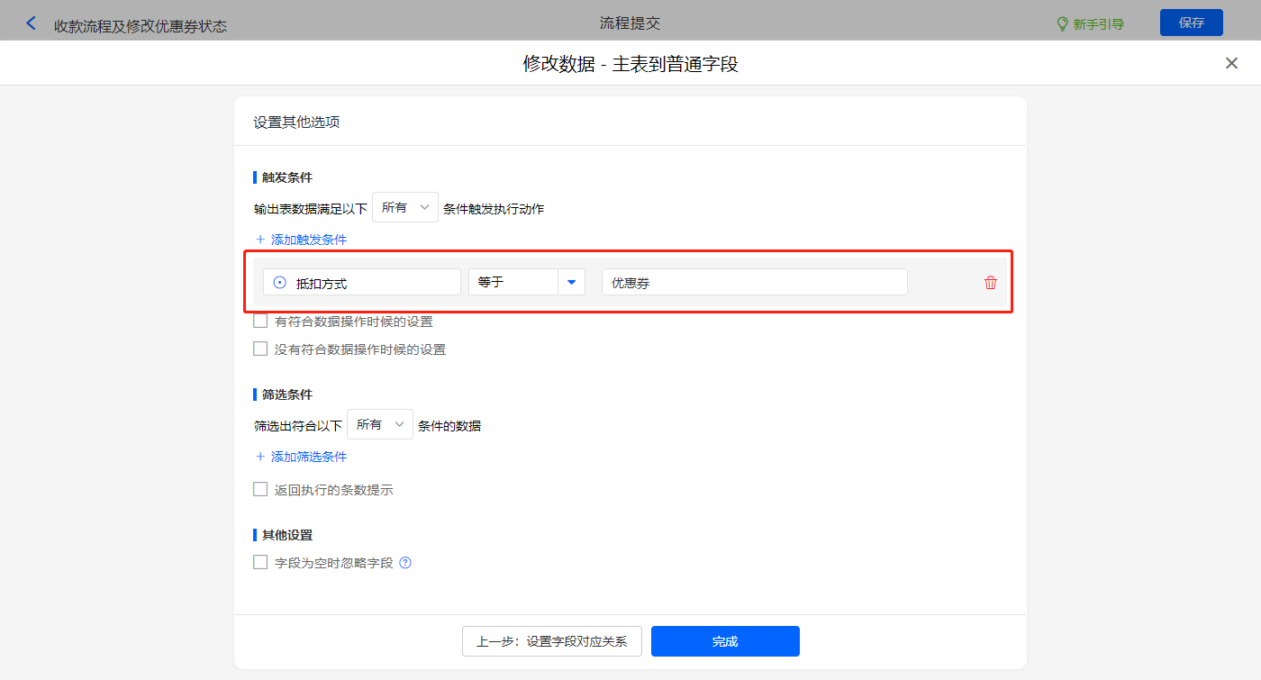 其他设置触发条件为【金额退回方式】等于优惠券,设置好点击【完成】并保存该数据助手;
