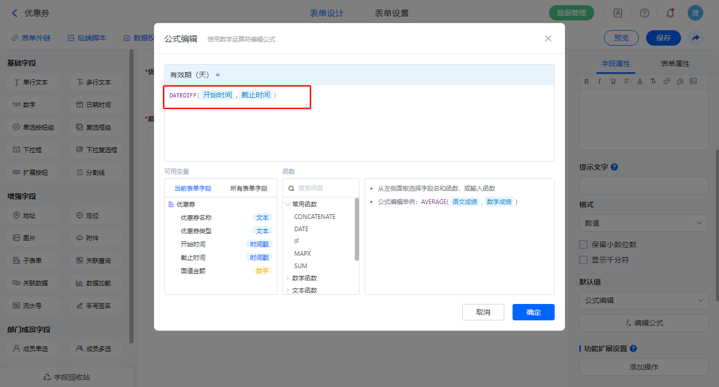 1)【有效期(天)】字段,默认值选择公式编辑,如图设置公式;