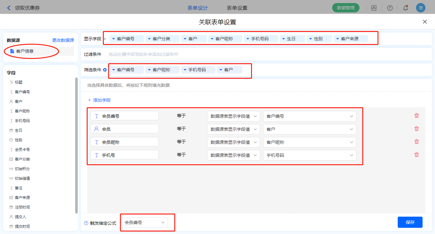 2)【领取会员】数据加载字段,数据源为【客户信息】,添加过滤条件及设置赋值字段,触发公式为【会员编号】字段;