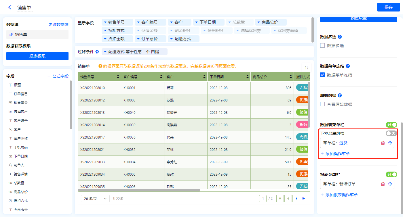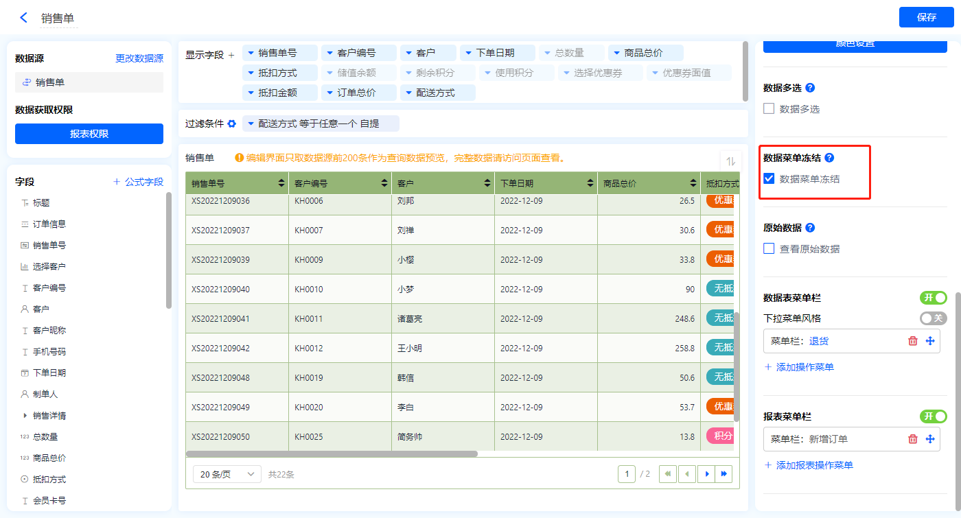 1)新增【自提销售单】报表,用基础报表【数据表】展示数据源为表单【销售单】的数据;