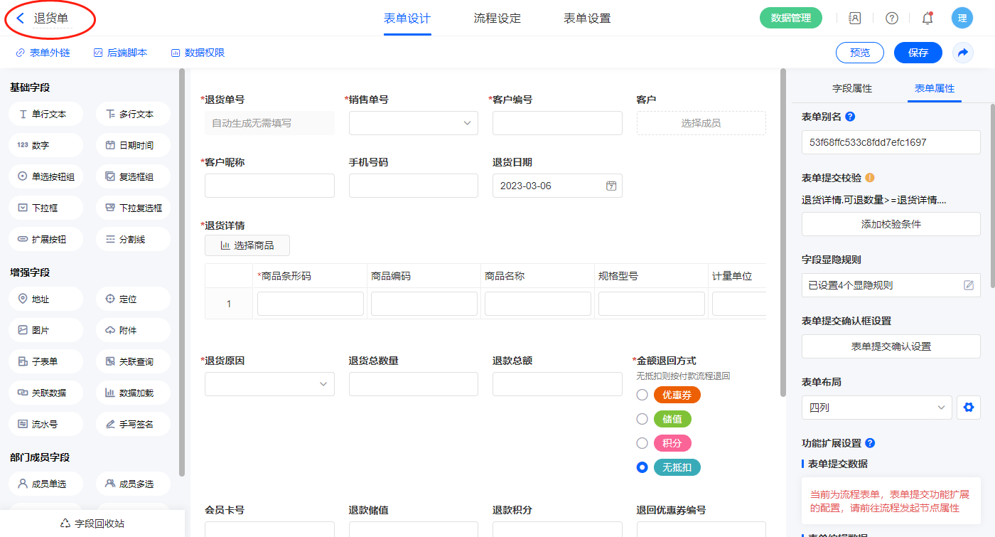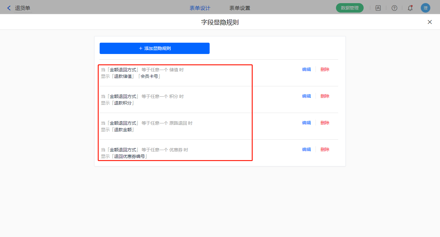 4)设置四条显隐规则,当【金额退回方式】字段等于优惠券显示【退回优惠券编号】字段,当【金额退回方式】字段等于储值显示【退回储值】字段,当【金额退回方式】字段等于积分显示【退回积分】字段,当【金额退回方式】字段等于原路退回显示【退款金额】字段;
