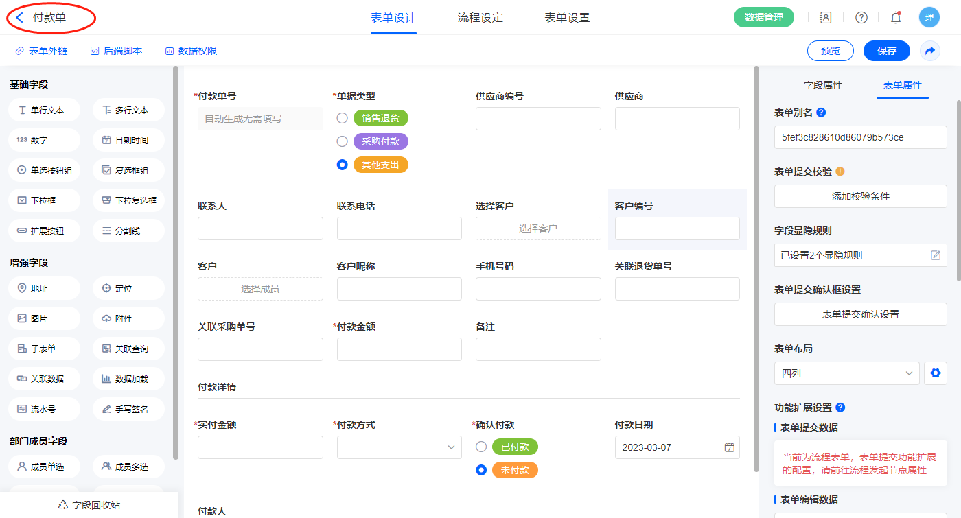 | 关联采购单号 | 单行文本 | 付款金额 | 数字 |
