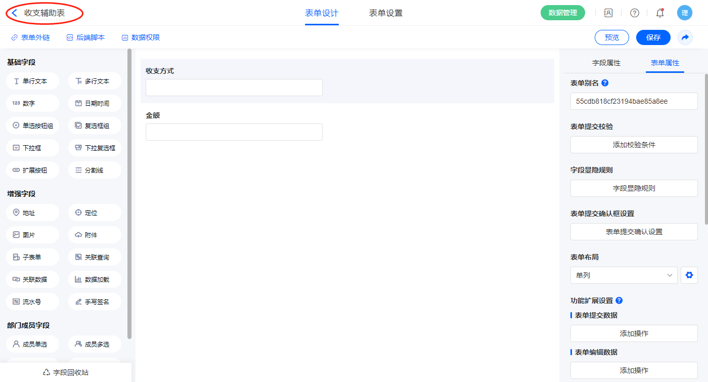 2)【实收金额】字段,默认值选择公式编辑,如图设置公式;