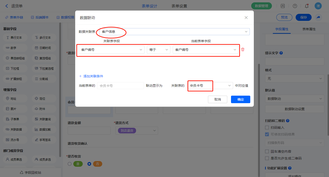 2)【会员卡号】字段,设置默认值为数据联动,设置联动条件及联动字段;