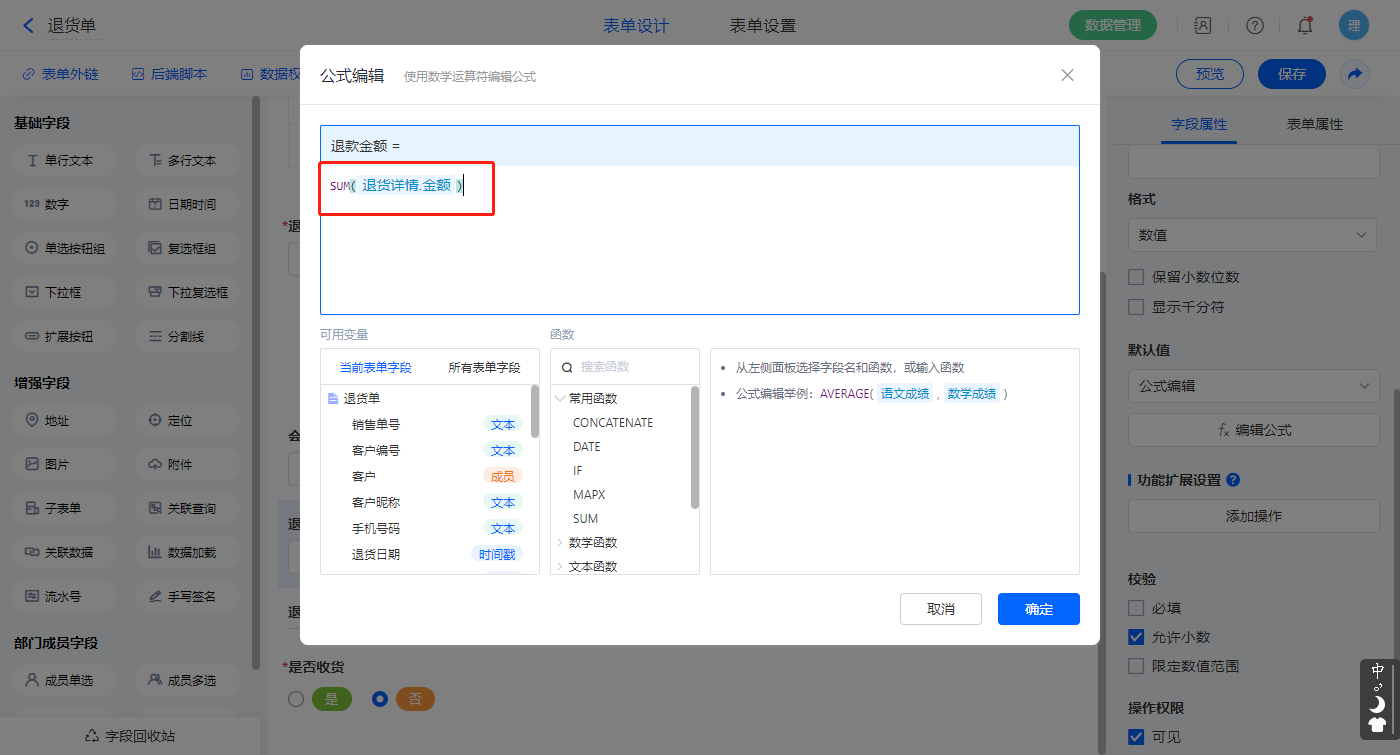 【退款金额】字段,设置默认值为公式编辑,如图设置公式;