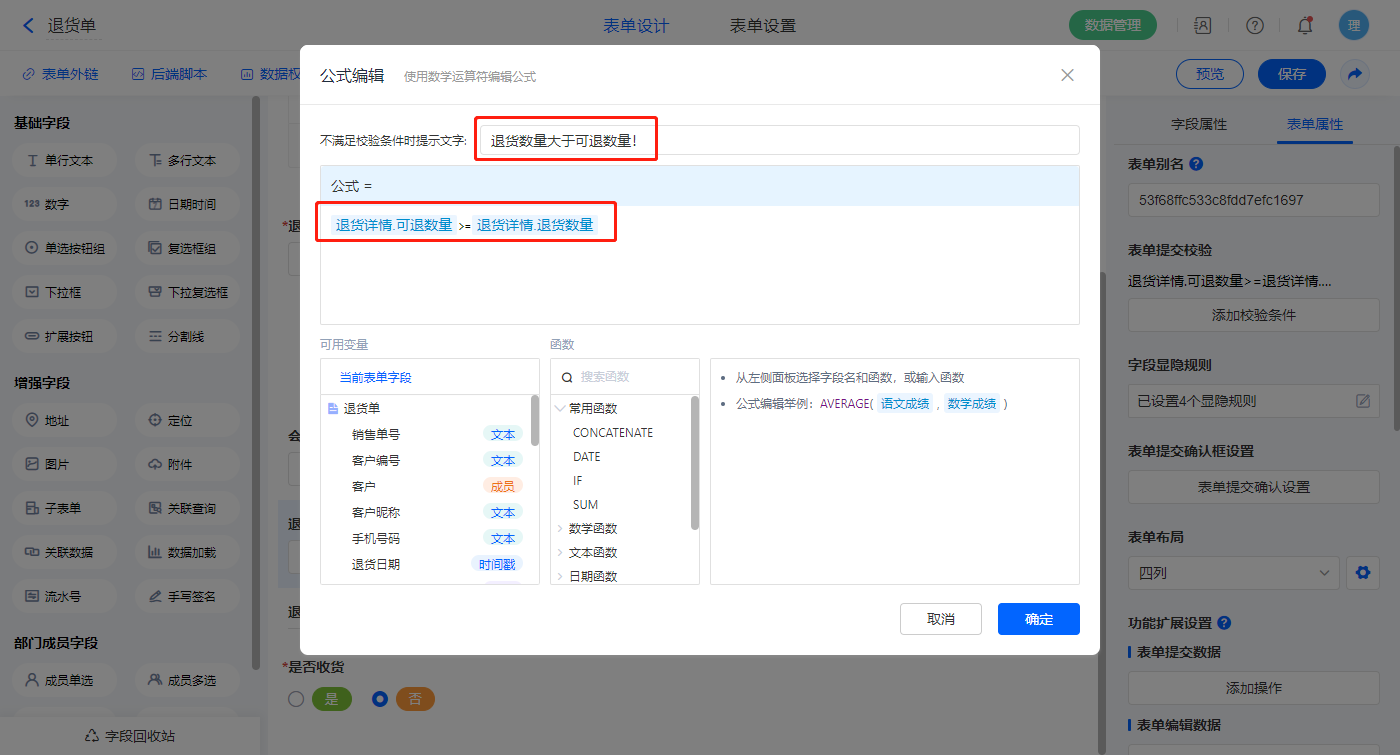 3)表单添加提交校验,当公式“退货详情.可退数量>=退货详情.退货数量”不满足提交时报“退货数量大于可退数量!”提示;