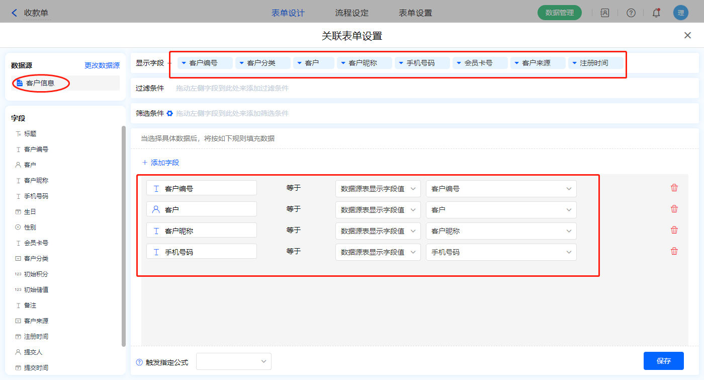 1)【选择客户】数据加载字段,数据源为【客户信息】,添加过滤条件及设置赋值字段,触发公式为【客户编号】字段;