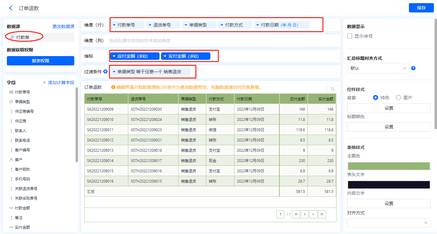 用基础报表【透视图】展示数据源为表单【付款单】的数据,添加过滤条件【单据类型】等于销售退货;