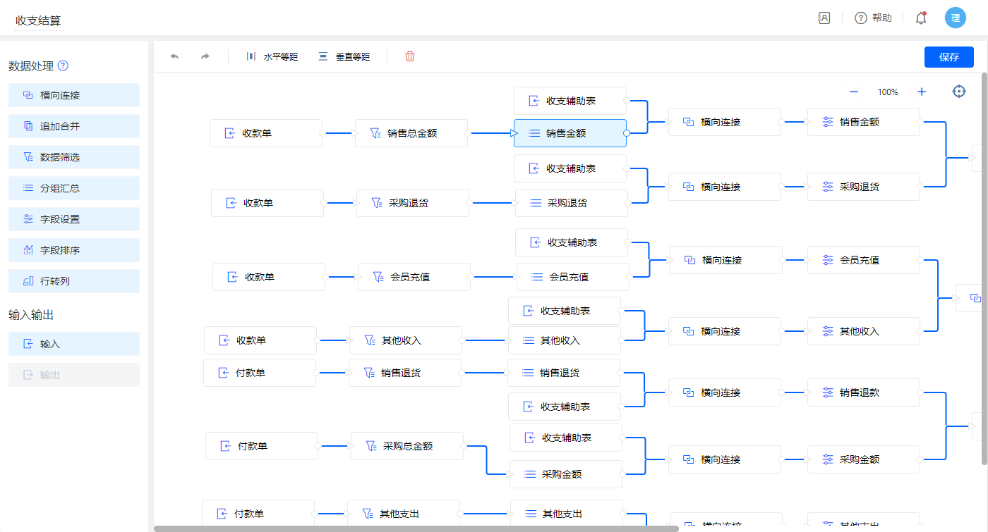 1)新增【销售订单结算】报表,用基础报表【透视图】展示数据源为表单【收款单】数据,添加过滤条件【单据类型】等于销售收款;