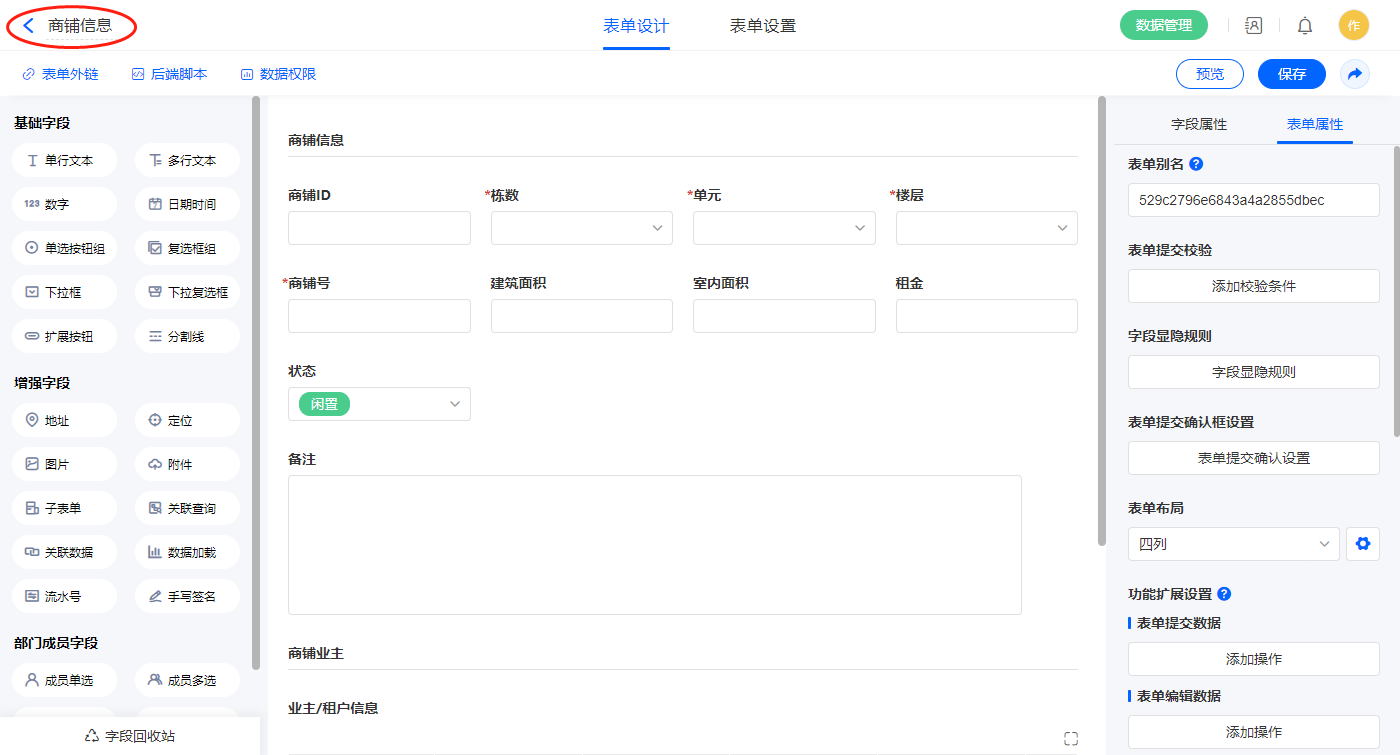 4)新增表单【商铺信息】,字段设置如下;