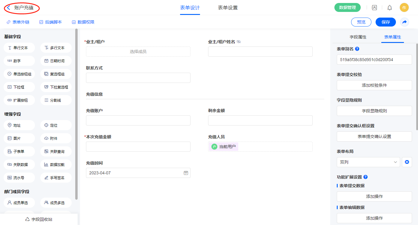 2.3、表单【业主账户】字段及表单属性设置