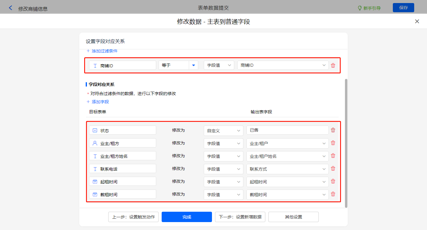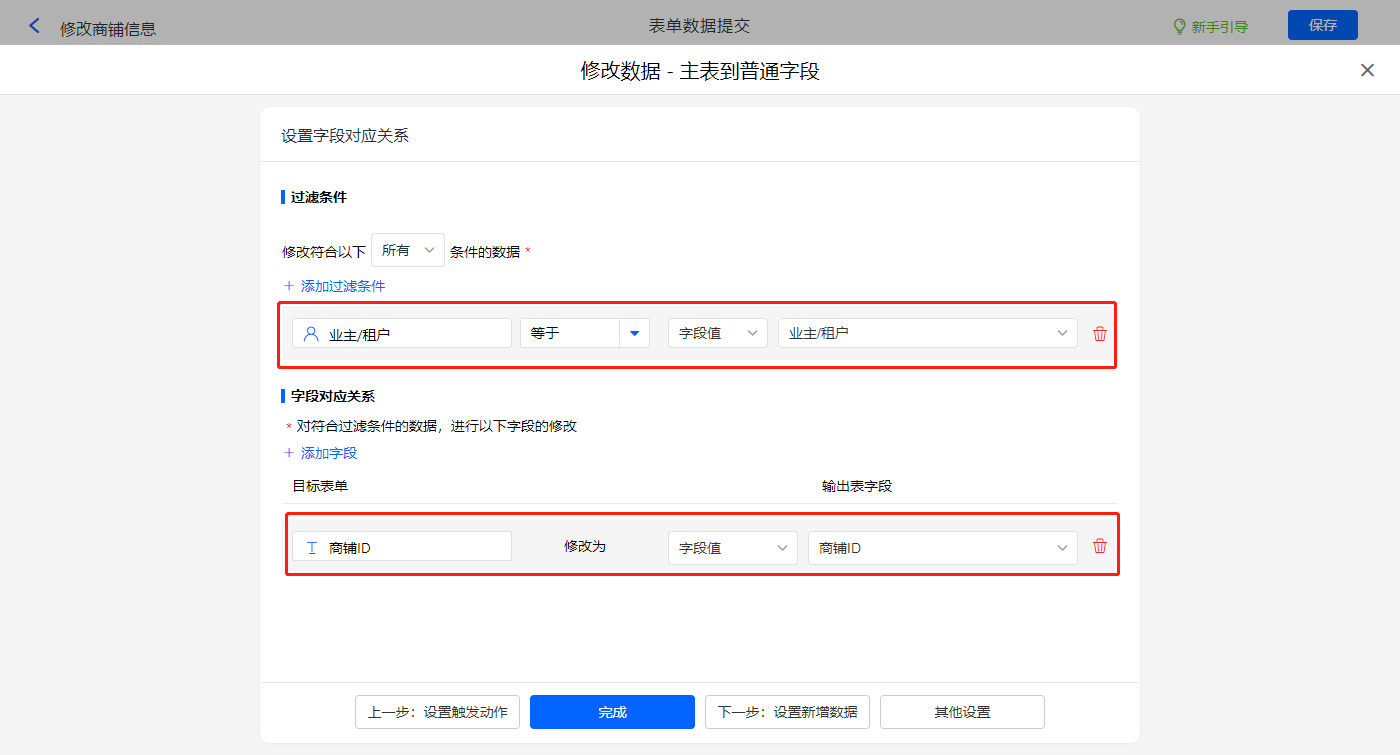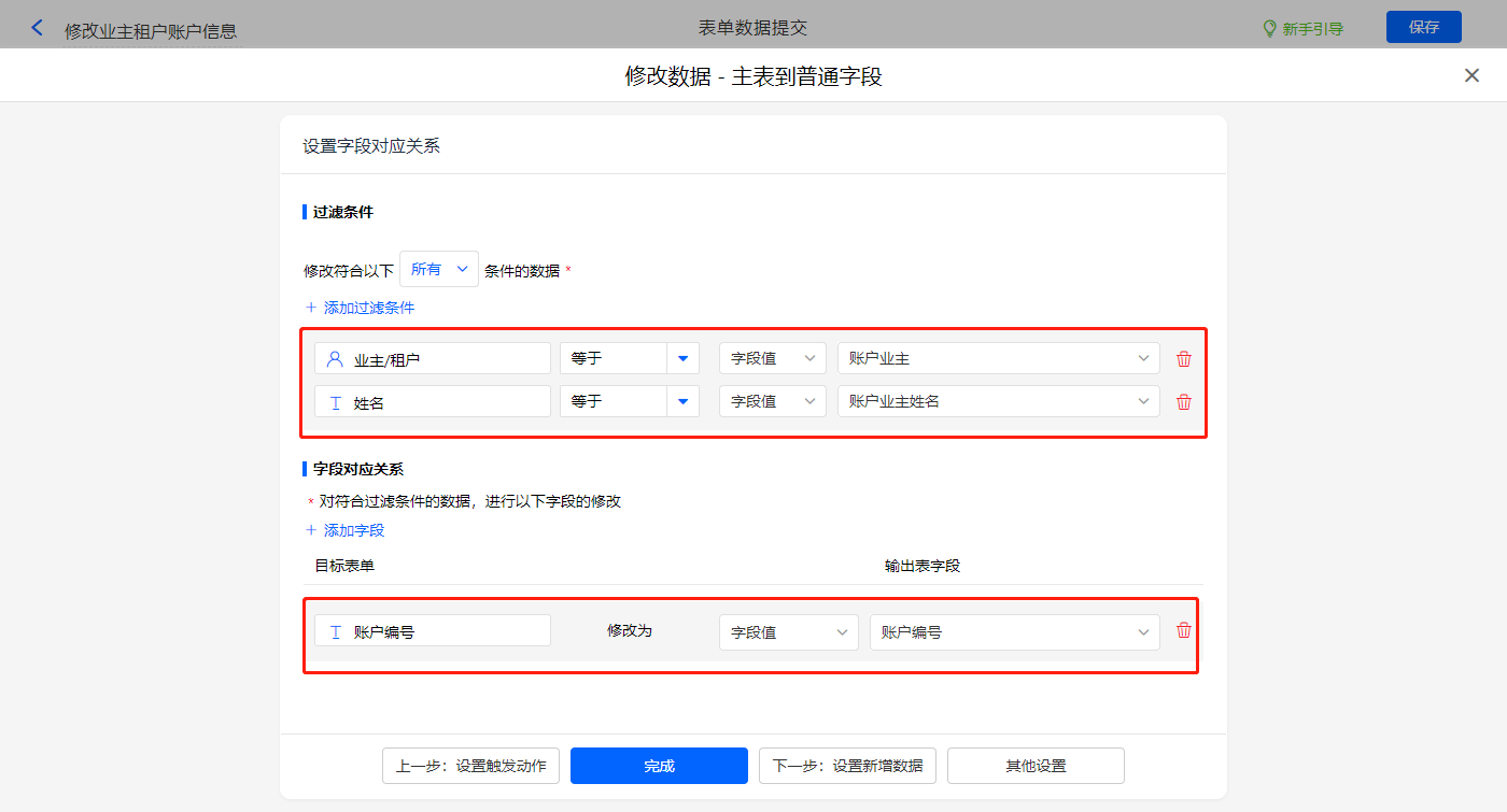 新增修改数据的执行动作,选择目标表单【业主信息】,配置过滤条件及对应赋值字段,设置好点击【完成】并保存该数据助手;