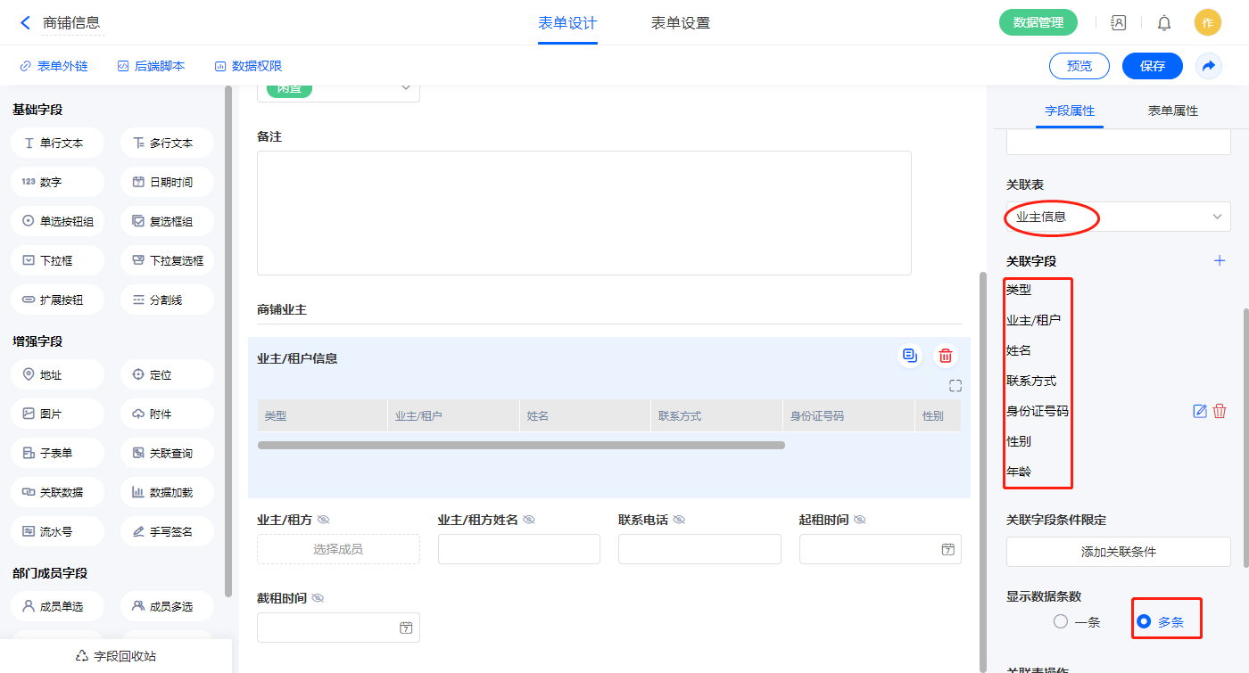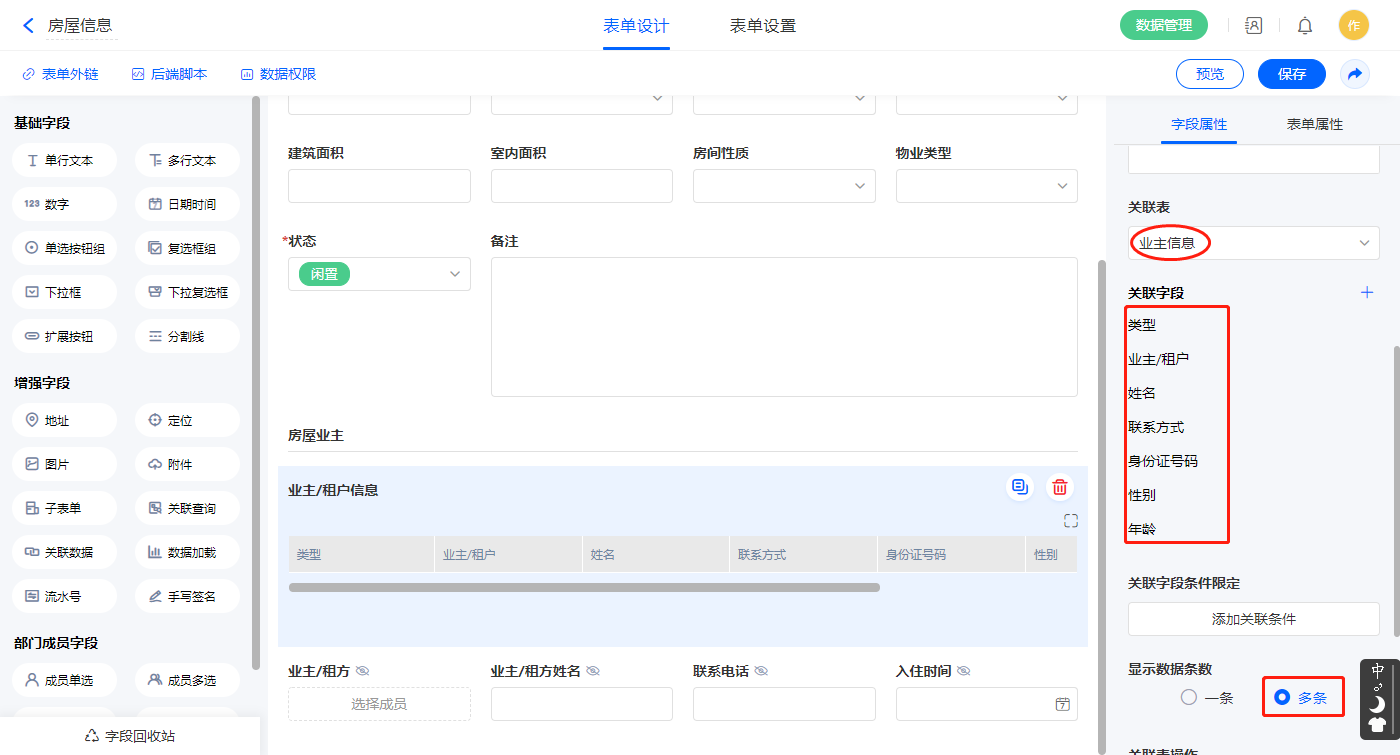 2)【业主/租户信息】关联查询字段,设置关联表为【业主信息】并如图选择关联字段,设置显示数据条数为多条;