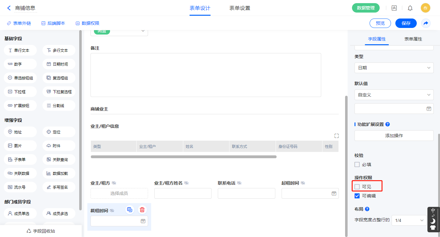 1)选中【业主/租方】、【业主/租方姓名】、【联系电话】、【起租时间】、【截租时间】字段,设置不可见;