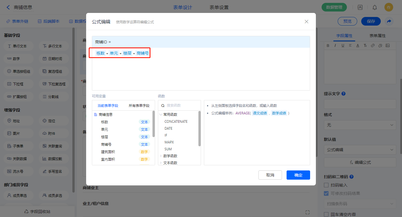 3)【商铺ID】字段,默认值选择公式编辑,如图设置公式;