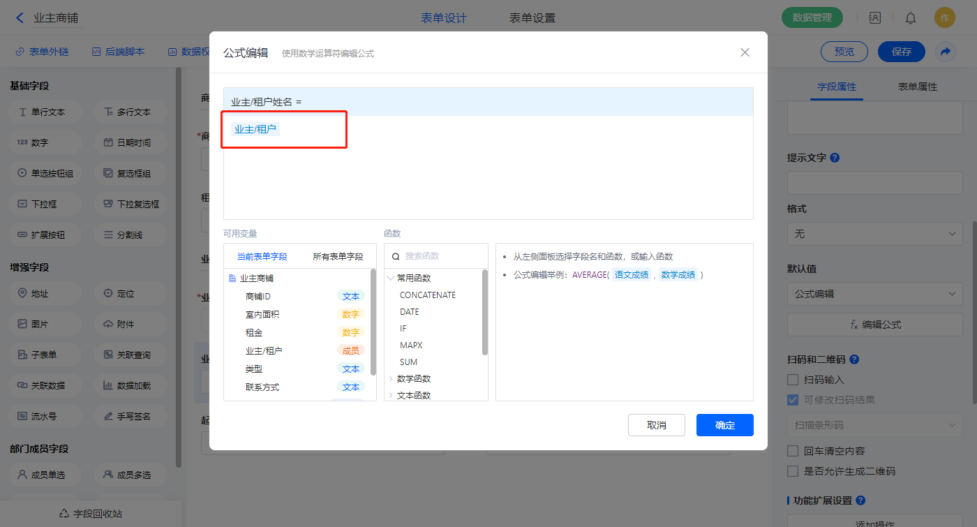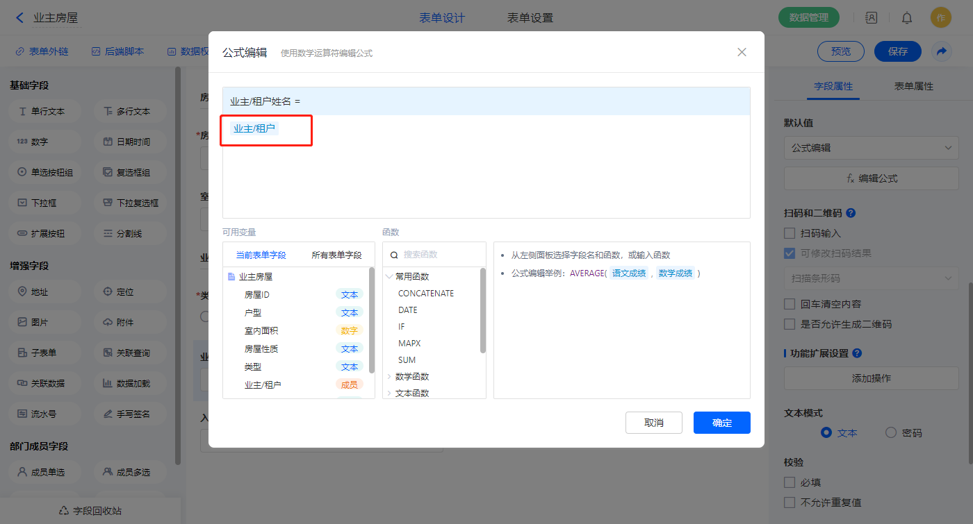 1)【业主/租户姓名】字段,默认值选择公式编辑,如图设置公式并权限设置不可见;