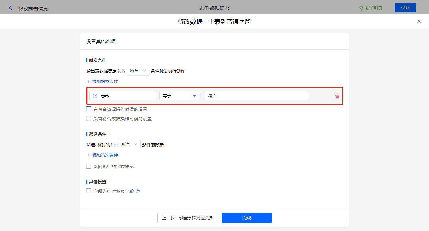 其他设置触发条件为【类型】等于租户,设置好点击【完成】并保存该数据助手;