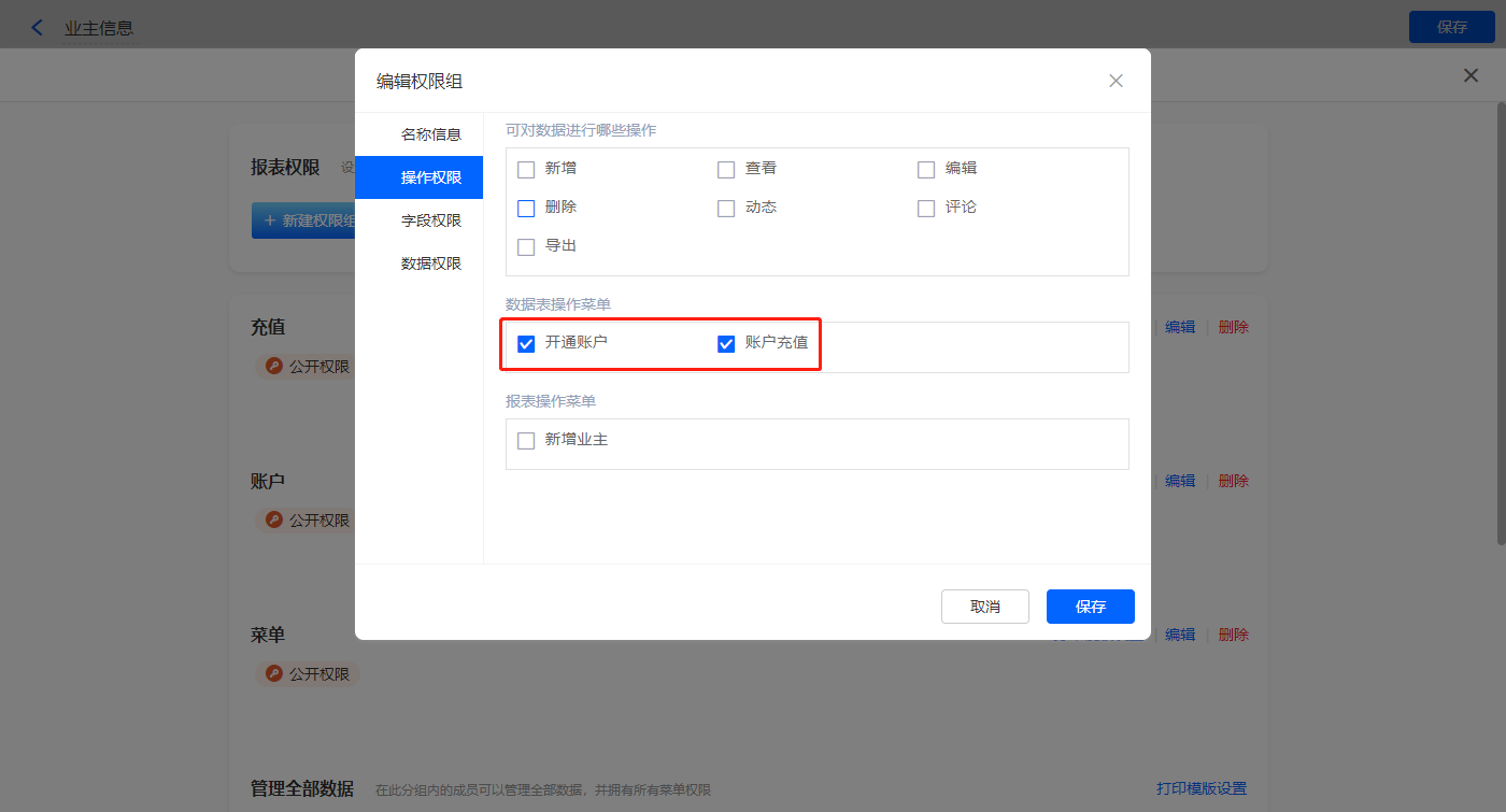 3)设置报表的权限,填入权限组名称,选择可操作的数据表菜单,点击【保存】;