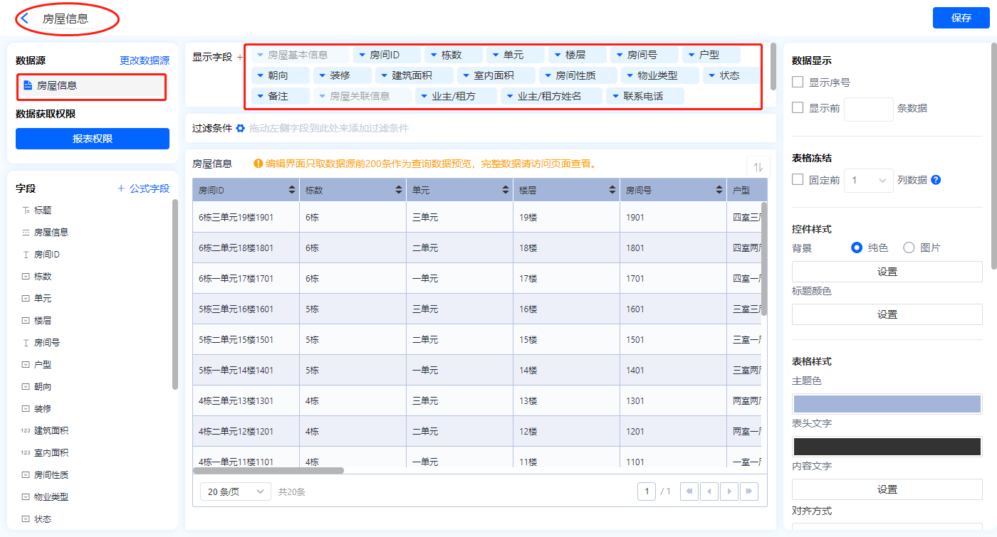 1)新增【房屋管理】报表,用基础报表【数据表】展示数据源为聚合表【房屋信息】的数据;