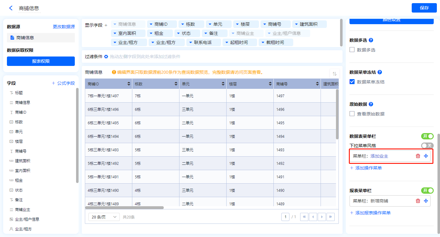 1)新增【商铺管理】报表,用基础报表【数据表】展示数据源为聚合表【商铺信息】的数据;